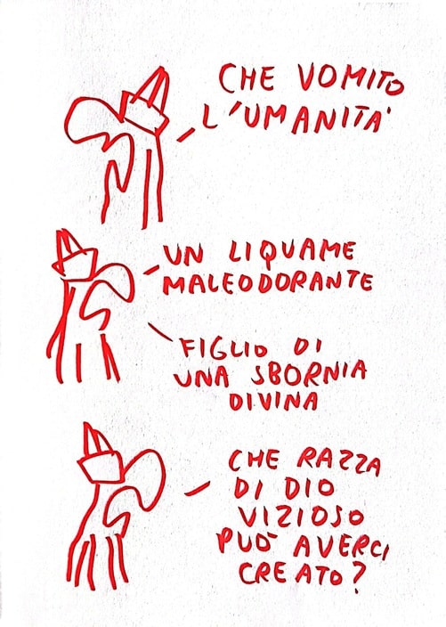 Maicol & Mirco, con il suo tratto essenziale e rosso, che pennella figure scarne su pagine bianche, costruisce un piccolo mondo sospeso, dove improvvisamente la solitudine è squarciata da una presenza inattesa.